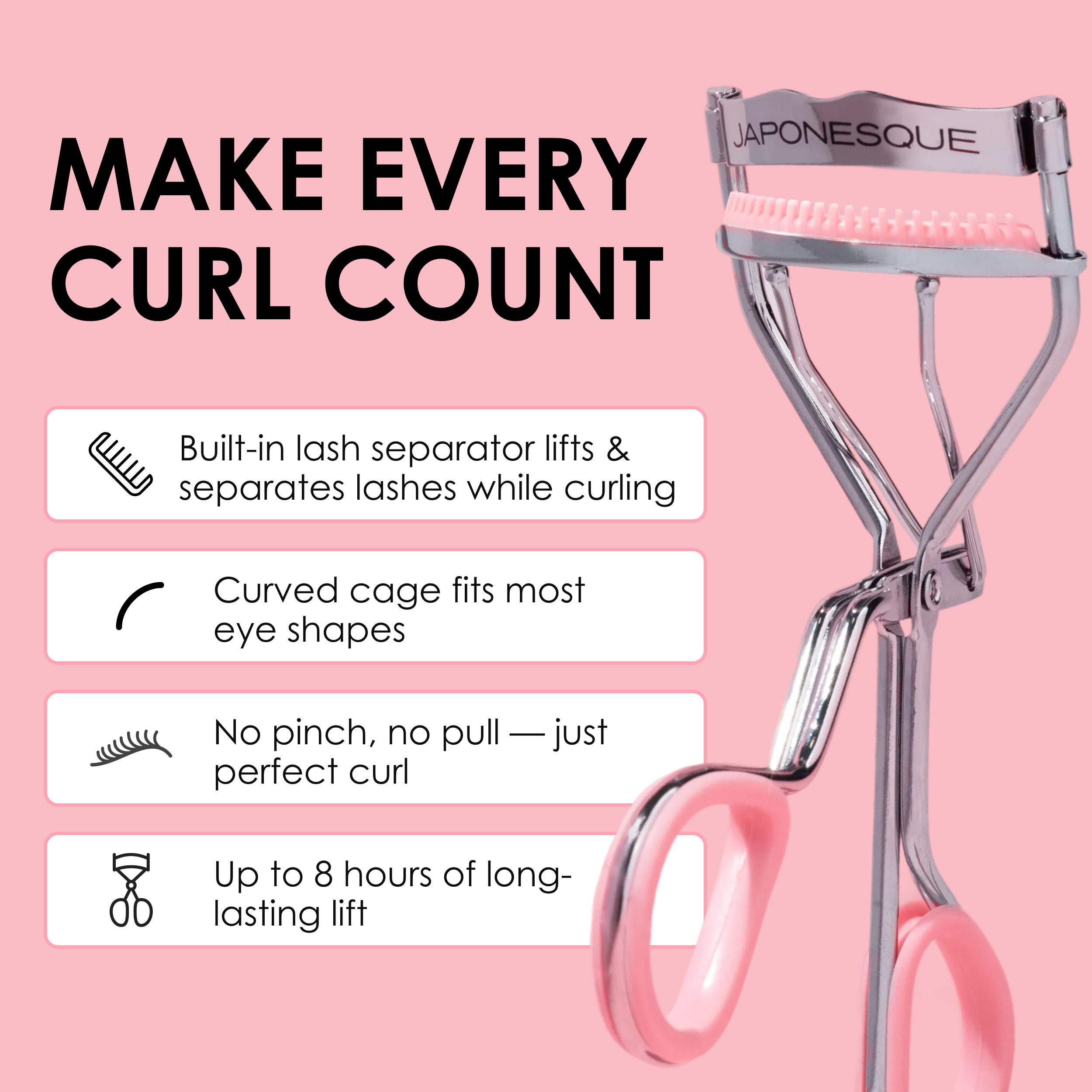 Precision crafted design delivers up to 8 hours of curl and the soft lash pad is gentle enough for both natural & false lashes.